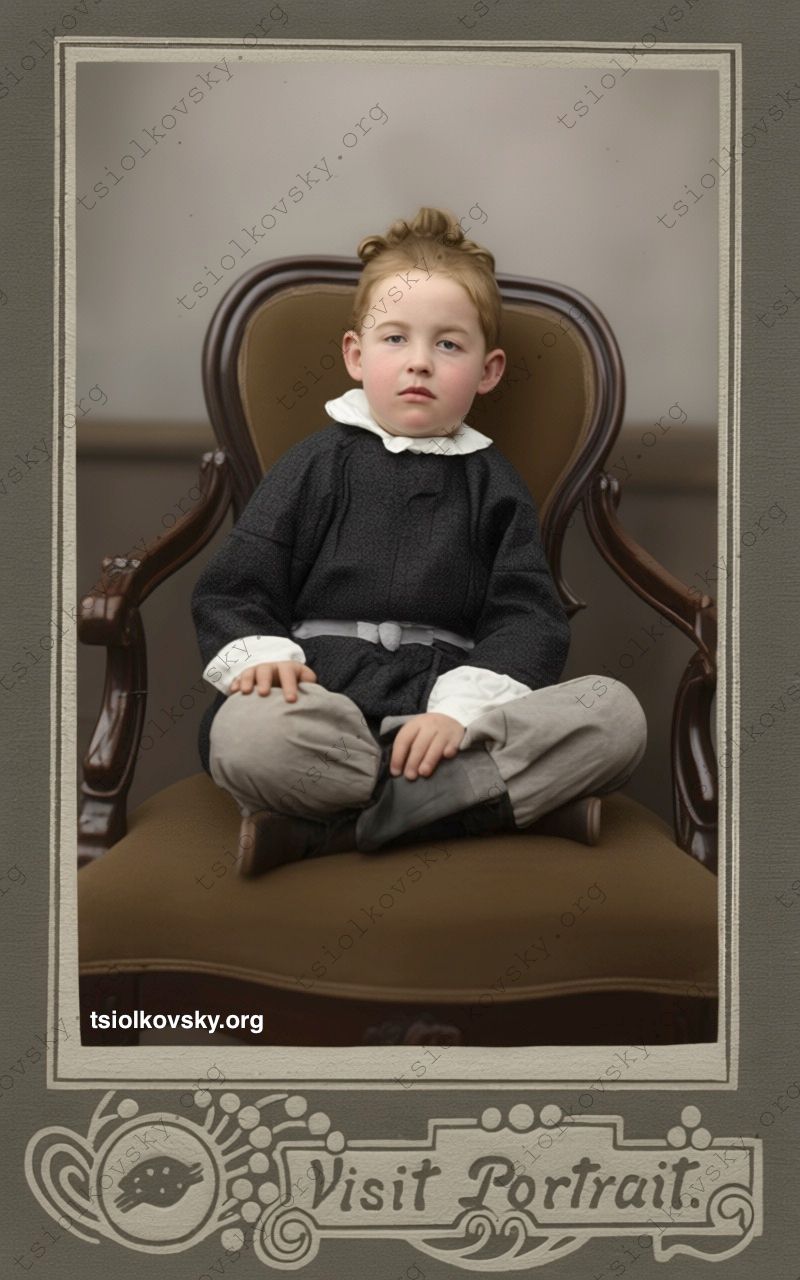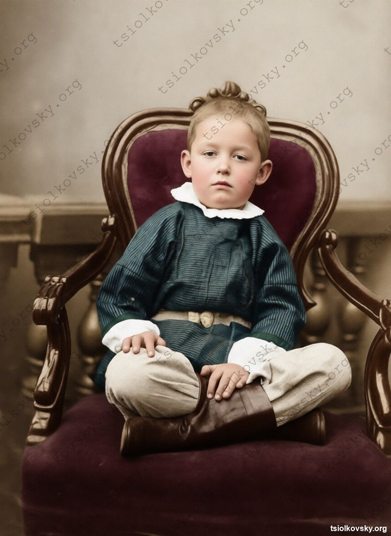 Константин Эдуардович Циолковский в возрасте 6-7 лет. Фотопортрет. 1863-1864. Фотоателье братьев Блюм. Цифровая копия оригинальной черно-белой фотографии Константина Эдуардовича Циолковского. Источник: Wikimedia Commons (Public Domain).  Фото К. Э. Циолковского в возрасте 4-5 лет. 1863-1864. Фотоателье братьев Блюм. Источник цифровой копии оригинальной фотографии: Wikimedia Commons (Public Domain). Восстановленная и колоризованная версия цифровой копии оригинальной черно-белой фотографии. Цифровая реставрация и колоризация проведена с применением технологий машинного обучения и нейросетевых алгоритмов в качестве инструментов предварительной обработки изображения: Mykola Krasnostup.