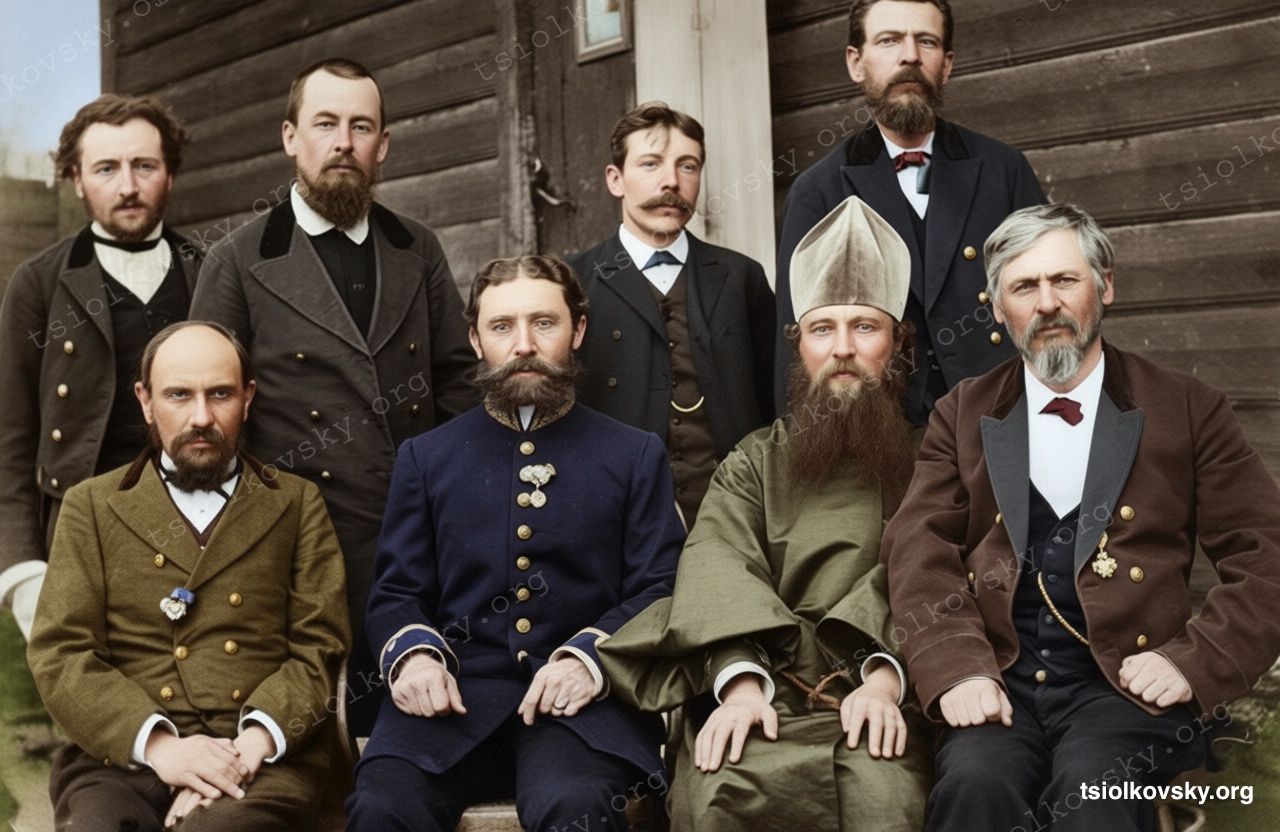 К. Э. Циолковский (во втором ряду второй слева) среди преподавателей Калужского училища. 1895. Цифровая копия оригинальной черно-белой фотографии Константина Эдуардовича Циолковского.  К. Э. Циолковский (во втором ряду второй слева) среди преподавателей Калужского училища. 1895. Восстановленная и колоризованная версия цифровой копии оригинальной черно-белой фотографии. Цифровая реставрация и колоризация проведена с применением технологий машинного обучения и нейросетевых алгоритмов в качестве инструментов предварительной обработки изображения: Mykola Krasnostup.